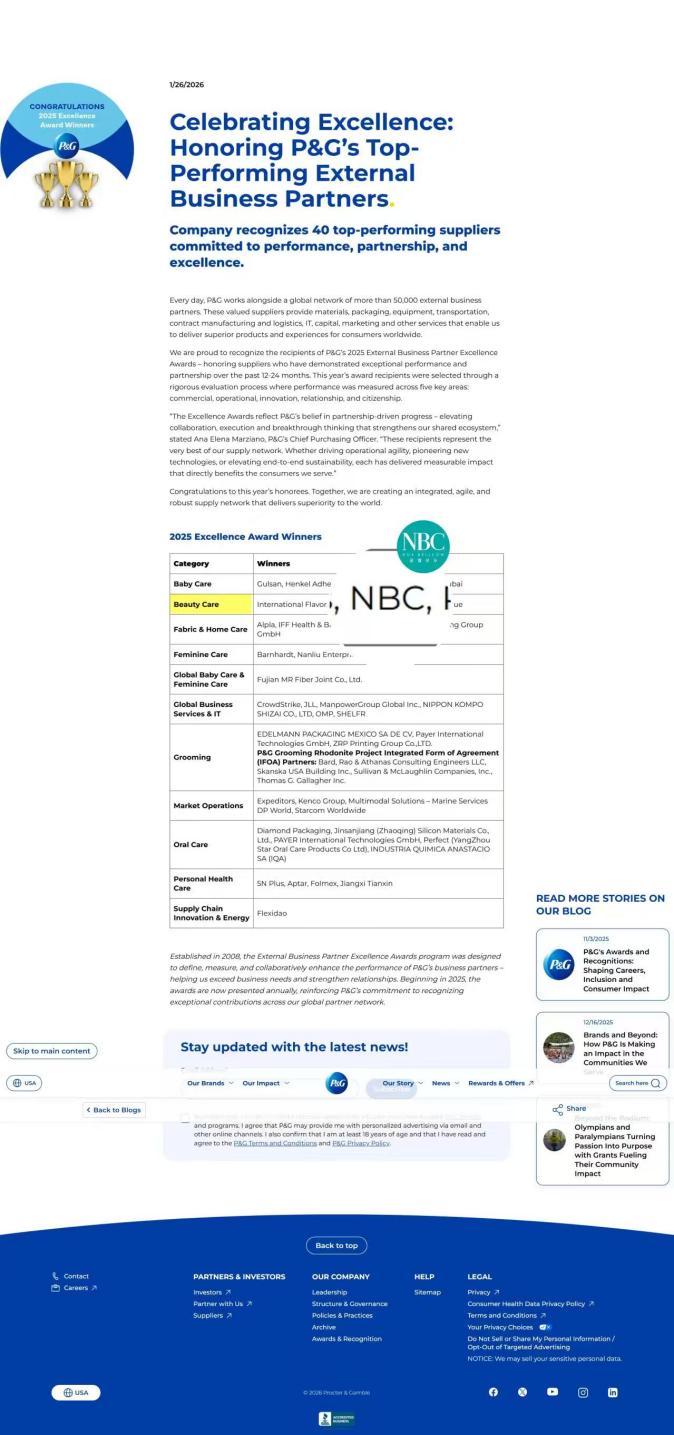 1月26日,宝洁官网发布2025年度全球外部业务合作伙伴卓越名单。这项自2008年设立的奖项,以高标准、严筛选、重实力闻名业界,围绕商业表现、运营效率、创新能力、合作关系及企业公民责任五大核心维度,进行全方位严苛考评。
