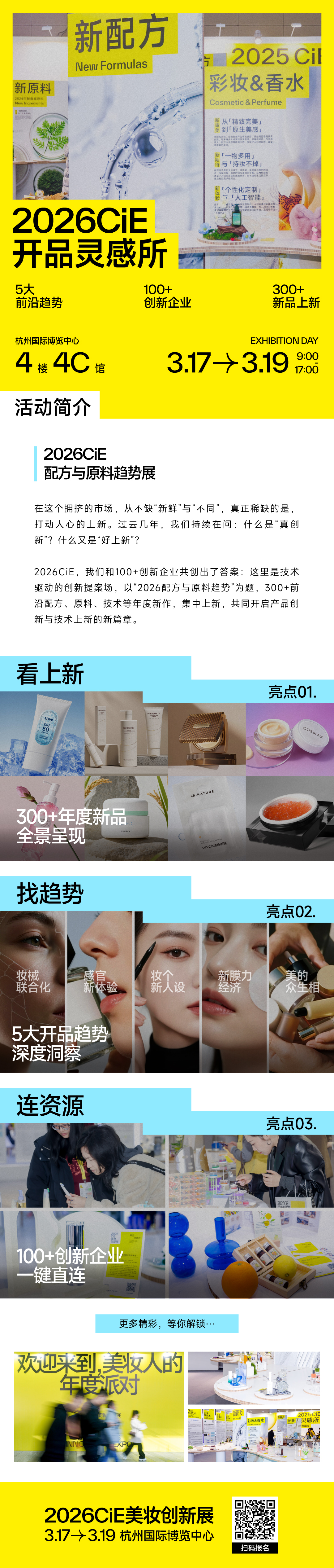 在这个拥挤的市场,从不缺“新鲜”与“不同”,真正稀缺的是,打动人心的上新。过去几年,我们持续在问:什么是“真创新”?什么又是“好上新”? 2026CiE,我们和100+创新企业共创出了答案:这里是技术驱动的创新提案场,以“2026配方与原料趋势”为题,300+前沿配方、原料、技术等年度新作,集中上新,共同开启产品创新与技术上新的新篇章。