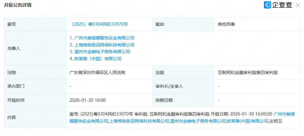1月30日,一场特殊的商标侵权案在深圳开庭。原告为美妆品牌赫莲娜在中国的运营主体(欧莱雅中国),被告则为在抖音上销售服饰、箱包的广州市赫莲娜服饰实业有限公司等多家企业,以及抖音平台方。
