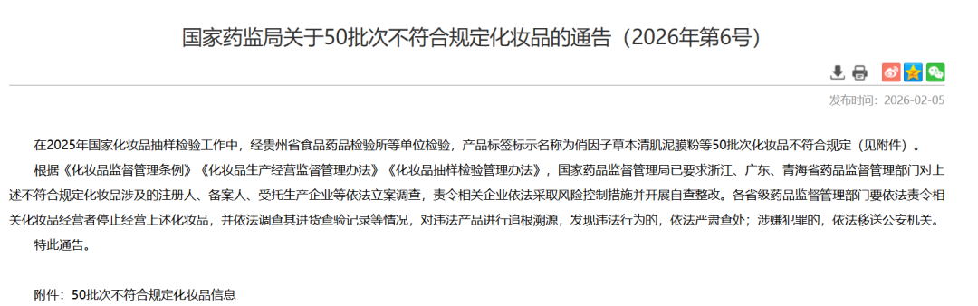 2025年开年至今,国家药品监督管理局已发布两则“不符合规定化妆品”通告,共涉及95批次产品,较去年同期的88批次增长约7.95%。