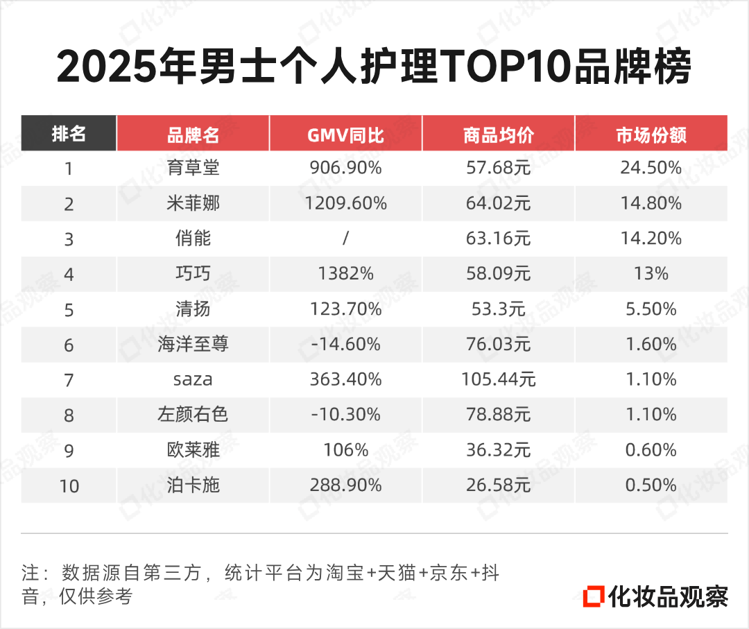 市场格局上,男士个人护理在线上高度集中,T0P10品牌占据了76.9%的市场份额。