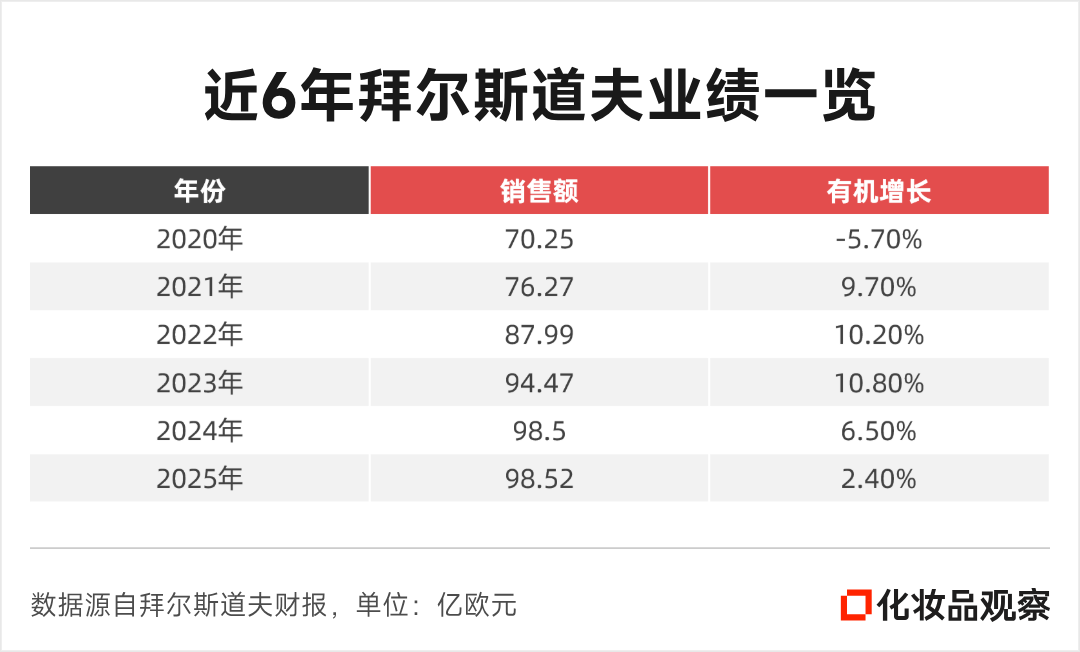 回望过去六年的业绩轨迹,拜尔斯道夫的销售额增速画出了一条清晰的弧线:从负增长攀升至双位数,而后又回落至低个位数。