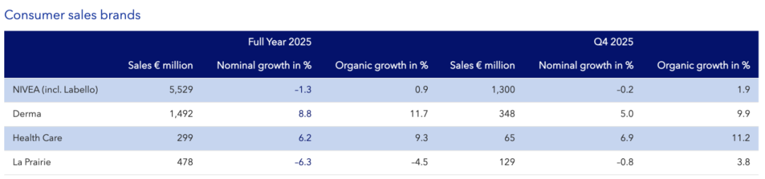 该业务中,妮维雅的销售额为55.29亿欧元(约合人民币451亿元),实现了0.9%的有机增长。财报中,拜尔斯道夫坦言,业绩反映出全球护肤品市场显著放缓,以及在中国市场业务的重新定位。妮维雅的创新产品线在2025年下半年才集中推出,因此全年创新对业绩的总体贡献有限。