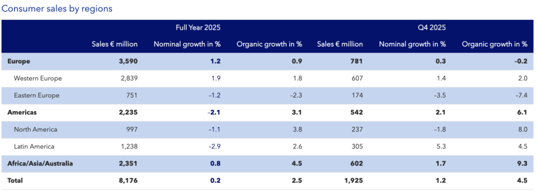2025年,消费品业务是重要增长引擎,占到了整个收入的八成以上,销售额约为82亿欧元(约合人民币670亿元),有机增长2.5%。