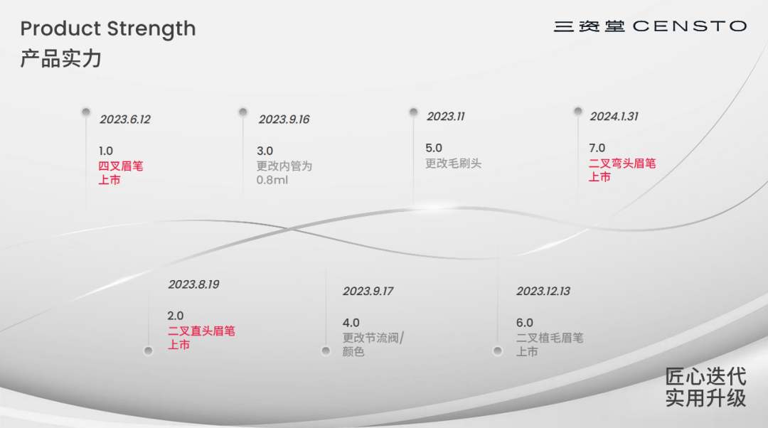 比如,三资堂眉笔从四叉到二叉、从直头到30°黄金弯头、从切毛到植毛、持续优化出水与持妆的7次迭代历程,并非简单的版本更新或者为了收割而强行升级,而是基于海量用户反馈的“匠心打磨”。