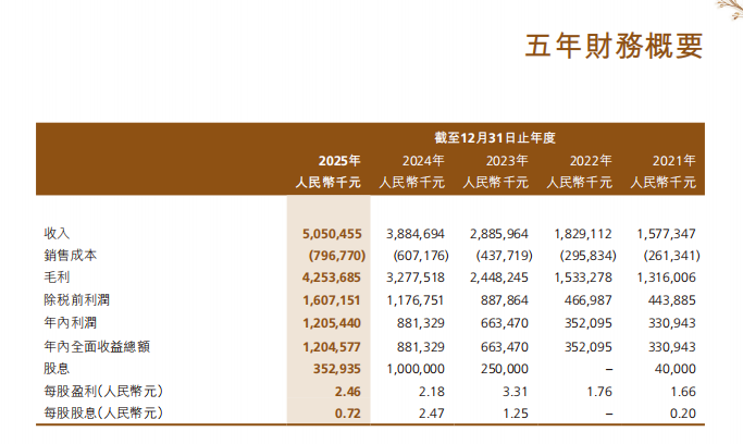 3月26日,毛戈平公布了2025年财报:2025年1—12月,毛戈平录得营收50.5亿元,同比增长30%;净利润12.05亿元,同比增长36.8%。