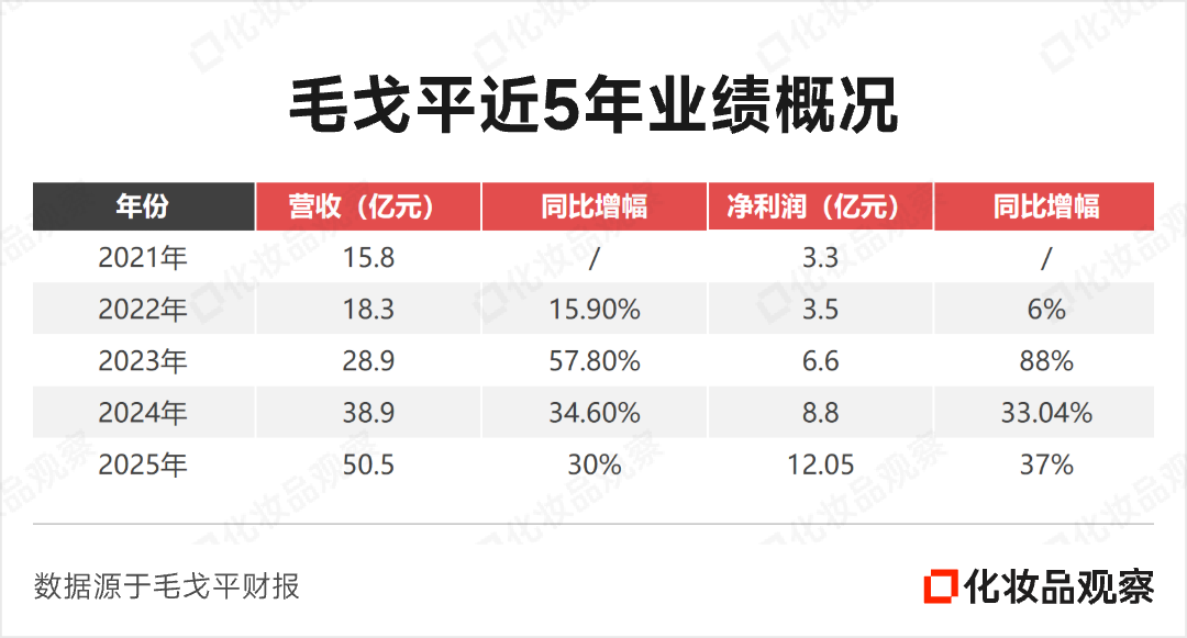 2025年,毛戈平增长势头依然强劲,营收上涨至50.5亿元,同比增长30%;净利润涨到12.05亿元,同比飙升36.8%。