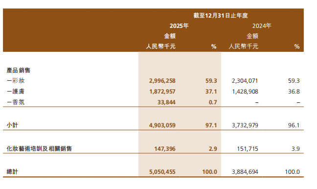 彩妆仍是毛戈平的“压舱石”。2025年其彩妆收入为29.96亿元,同比增长30%,占总收入的59.3%。