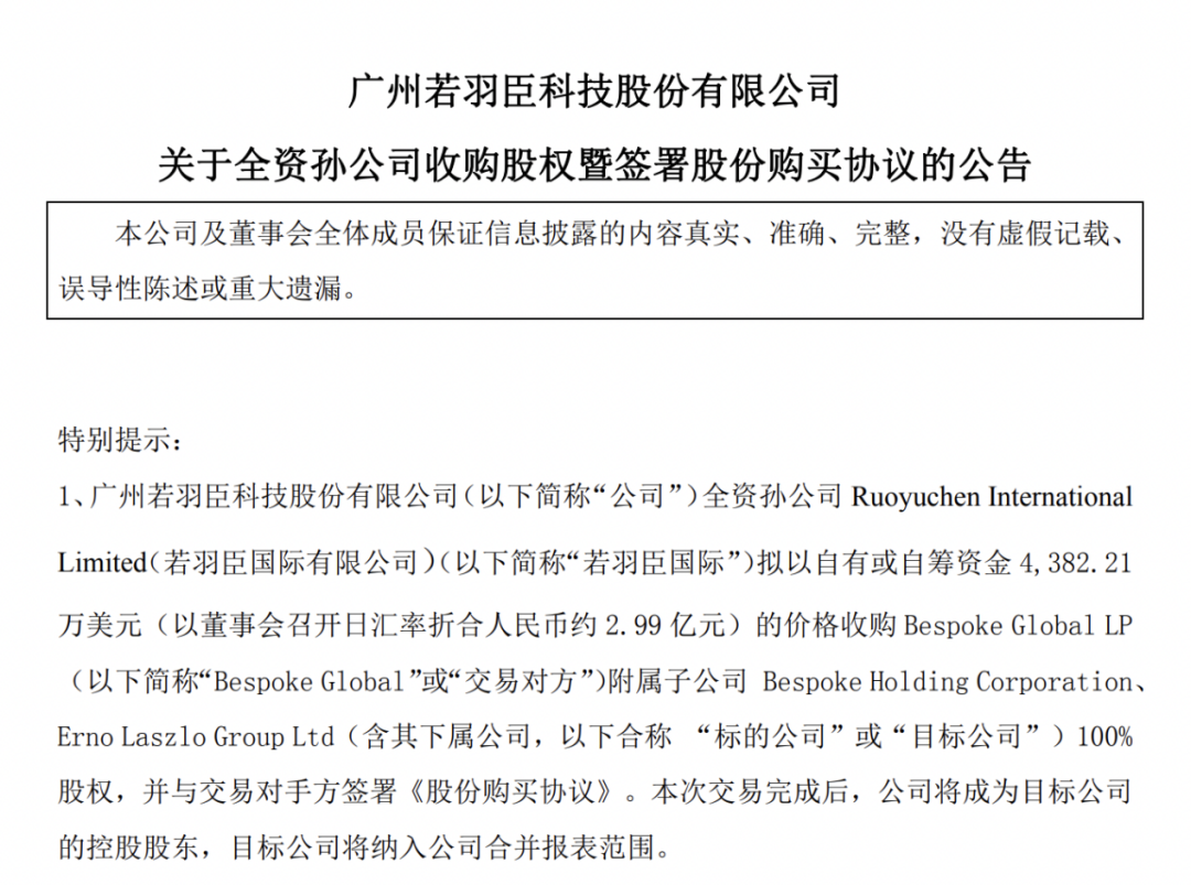 根据若羽臣公告,4月10日召开第四届董事会第十四次会议,审议通过《关于全资孙公司收购股权暨签署股份购买协议的议案》,同意公司孙公司若羽臣国际与Bespoke Global 签署《股份购买协议》,根据各方协商一致结果,同意若羽臣国际以4382.21万美元(以董事会召开日汇率折合人民币约2.99亿元)的价格收购Bespoke Global附属子公司 Bespoke Holding Corporation、Erno Laszlo Group Ltd(含其下属公司)100%股权。