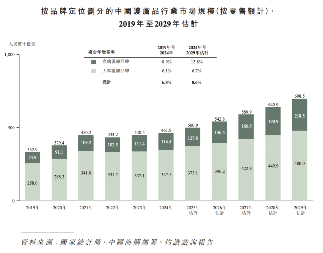 灼识咨询数据显示,2024年整体市场规模已达4619亿元,其中高端护肤细分市场规模突破1144亿元,正式迈入千亿量级。预计到2025年,高端护肤品牌市场规模将达1278亿元,同比增长11.7%,成为行业最具吸引力的增长极。