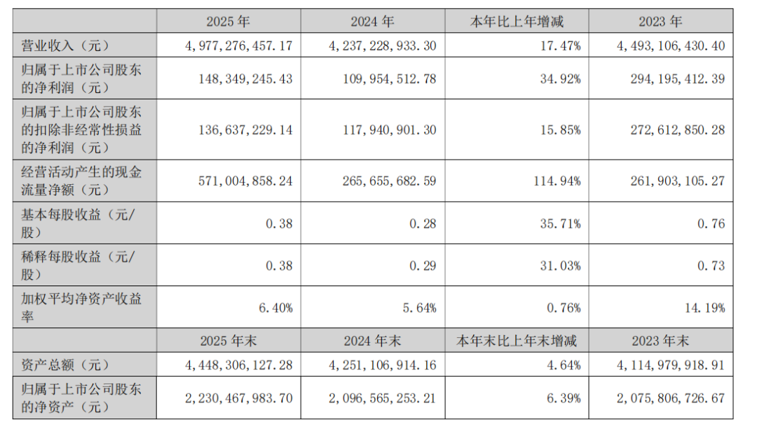 2025年财报显示,公司全年实现营业收入49.77亿元,同比大增17.47%;归母净利润1.48亿元,同比增长34.92%。更令市场振奋的是,其经营活动产生的现金流量净额猛增114.94%,达到5.71亿元,造血能力远超账面利润本身。