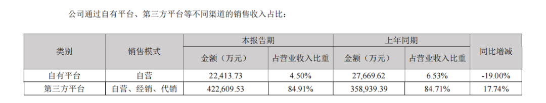 按销售渠道划分,线上自营成为引擎,抖音渠道表现亮眼。据财报披露,线上自有平台自营收入为2.24亿元,占营收比重为4.50%,同比下滑19.00%;提供自营、经销、代销的第三方平台收入为42.26亿元,占营收比重为84.91%,同比增长17.74%。