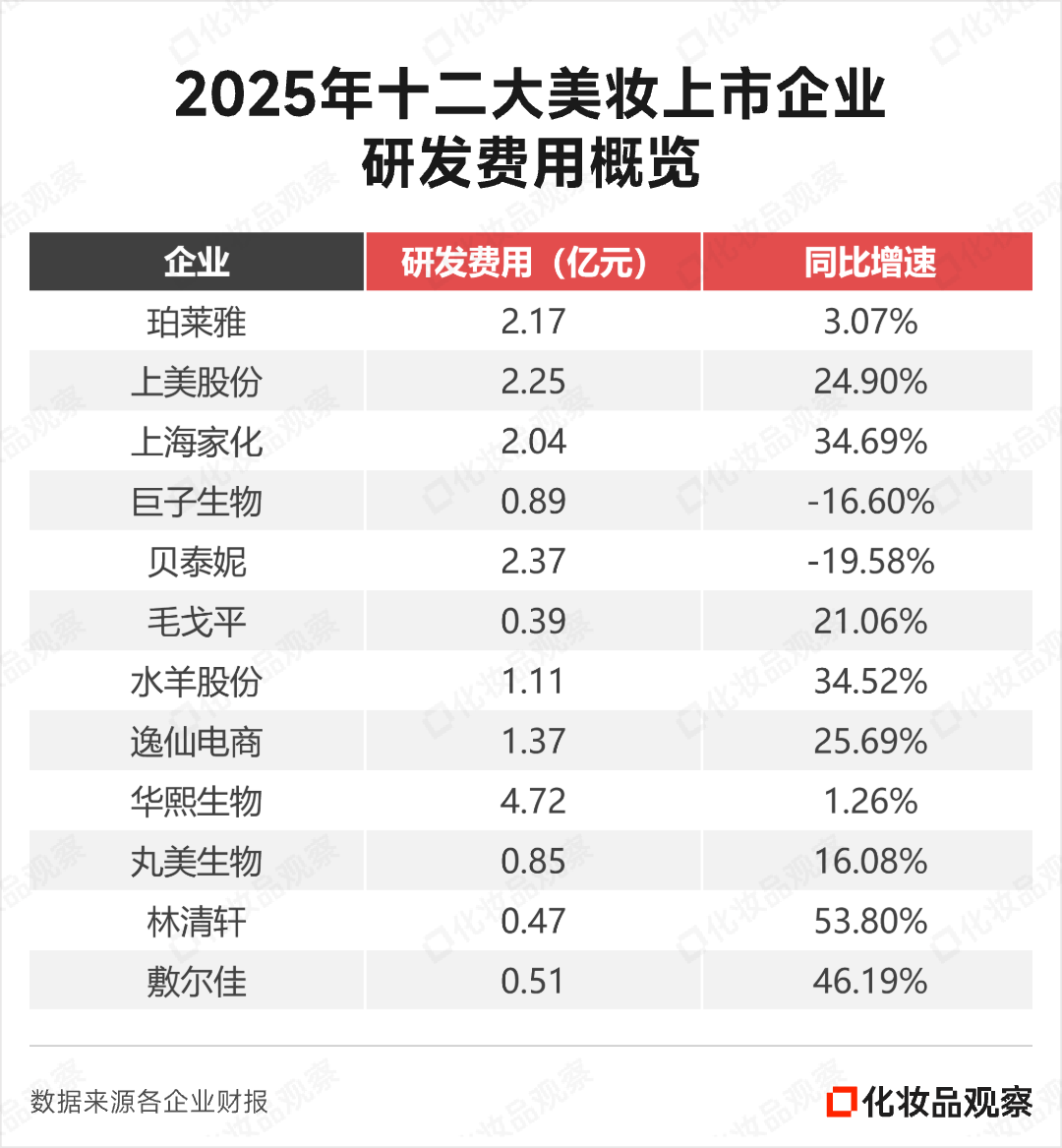 头部国货美妆,仍在研发上狠下功夫。过去一年,12家上市企业中,有5家研发费用超过2亿元,较2024年增加2家。
