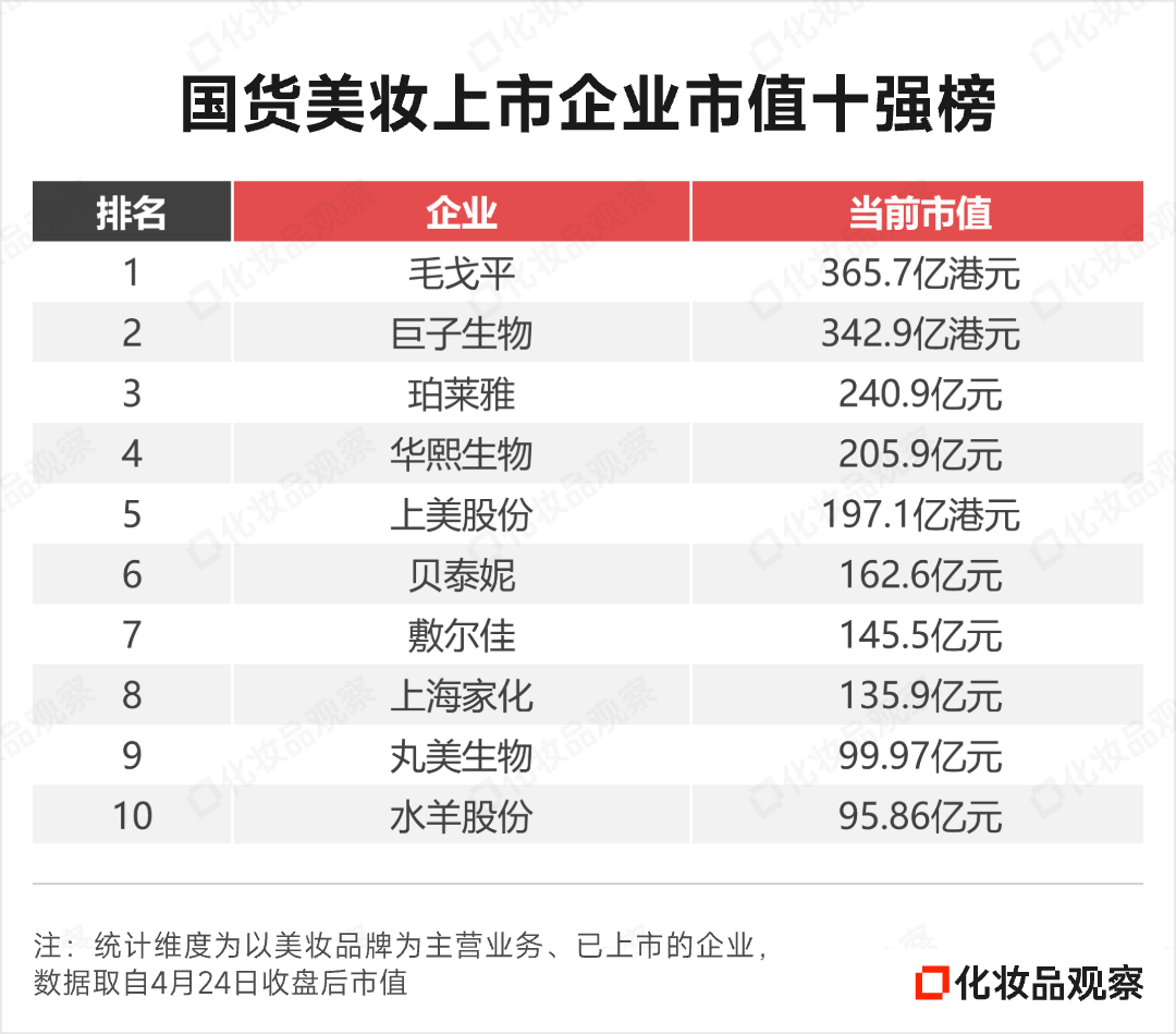 《化妆品观察》整理制得《2023年至2025年国货美妆上市企业十强榜单》。